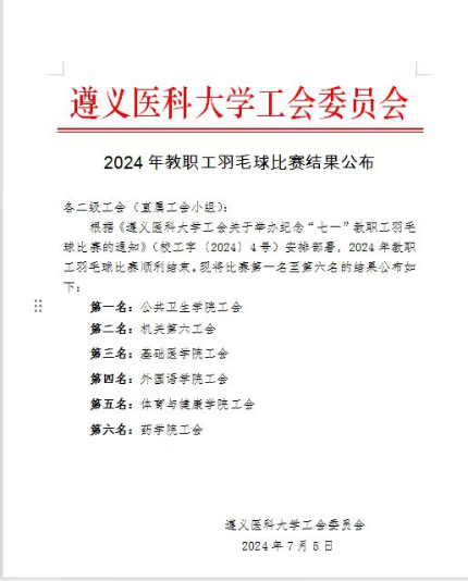为认真落实全民健身计划行动,丰富教职工的体育文化生活,营造健康、和谐、充满活力的校园文化氛围,激励广大教职工奋进新征程、再创新辉煌。7月4日—5日,公司工会在新蒲校区北区体育馆举行教职工羽毛球比赛。太阳成集团tyc234cc主页工会组织10名教职工参加比赛。