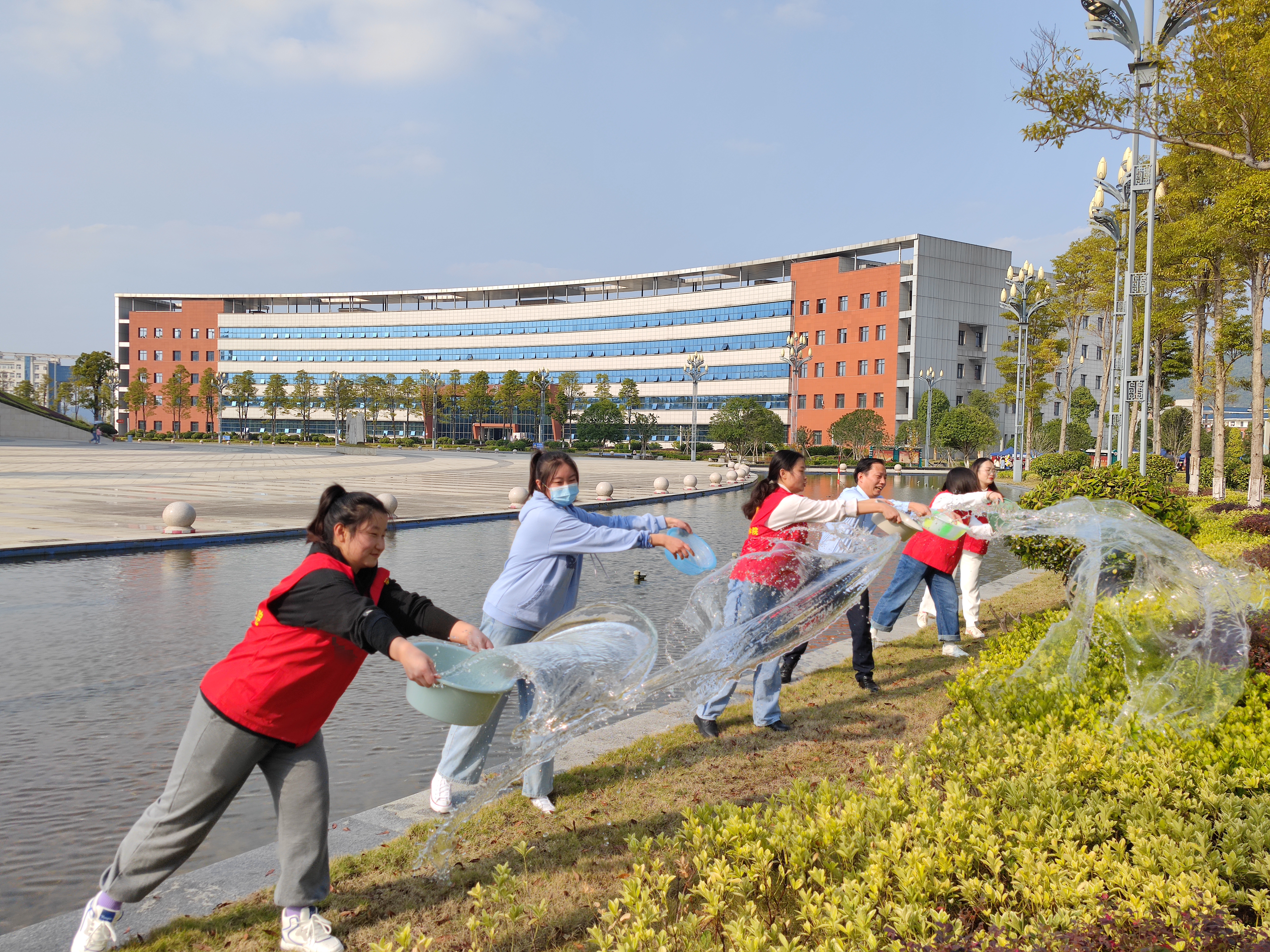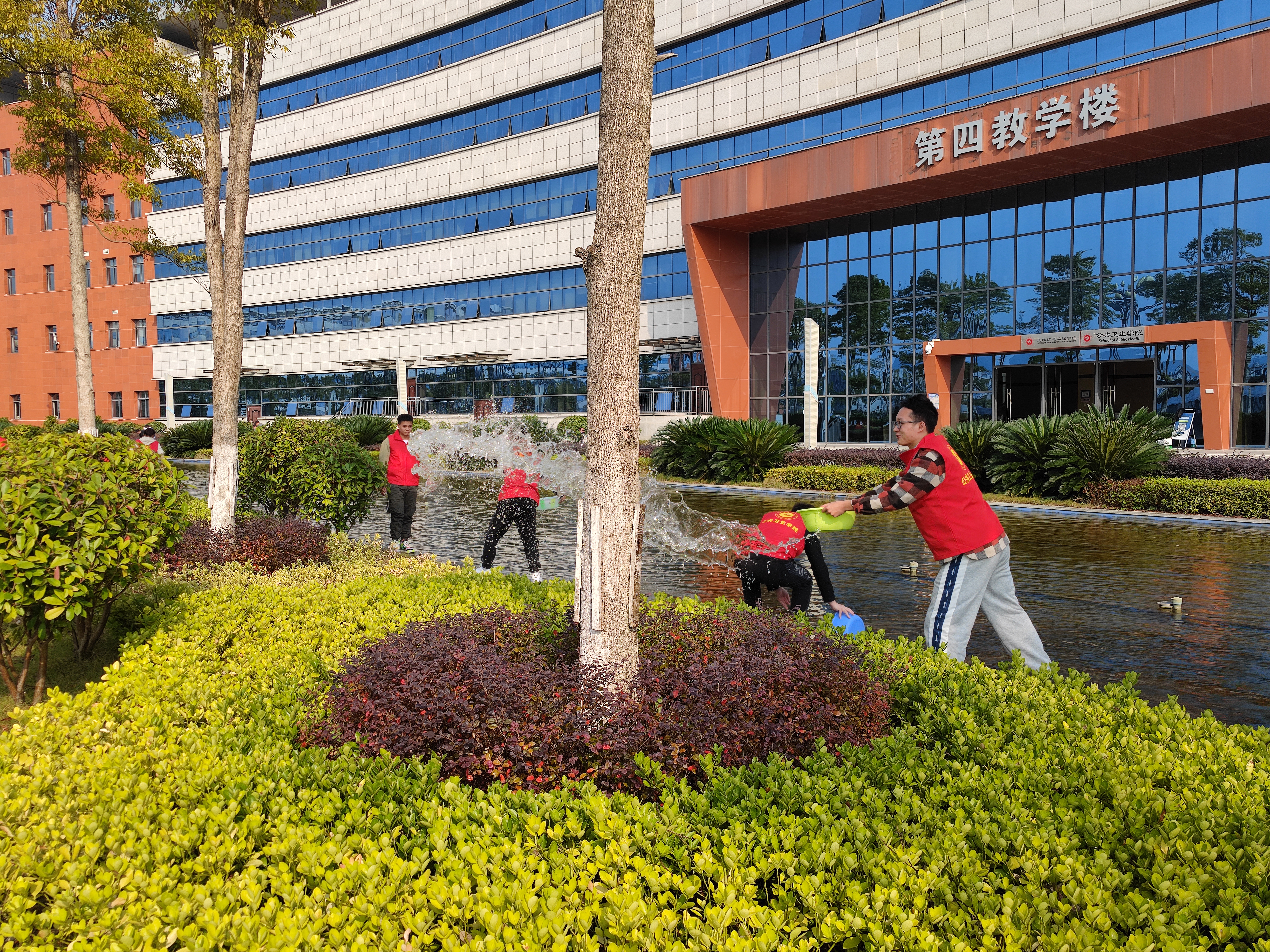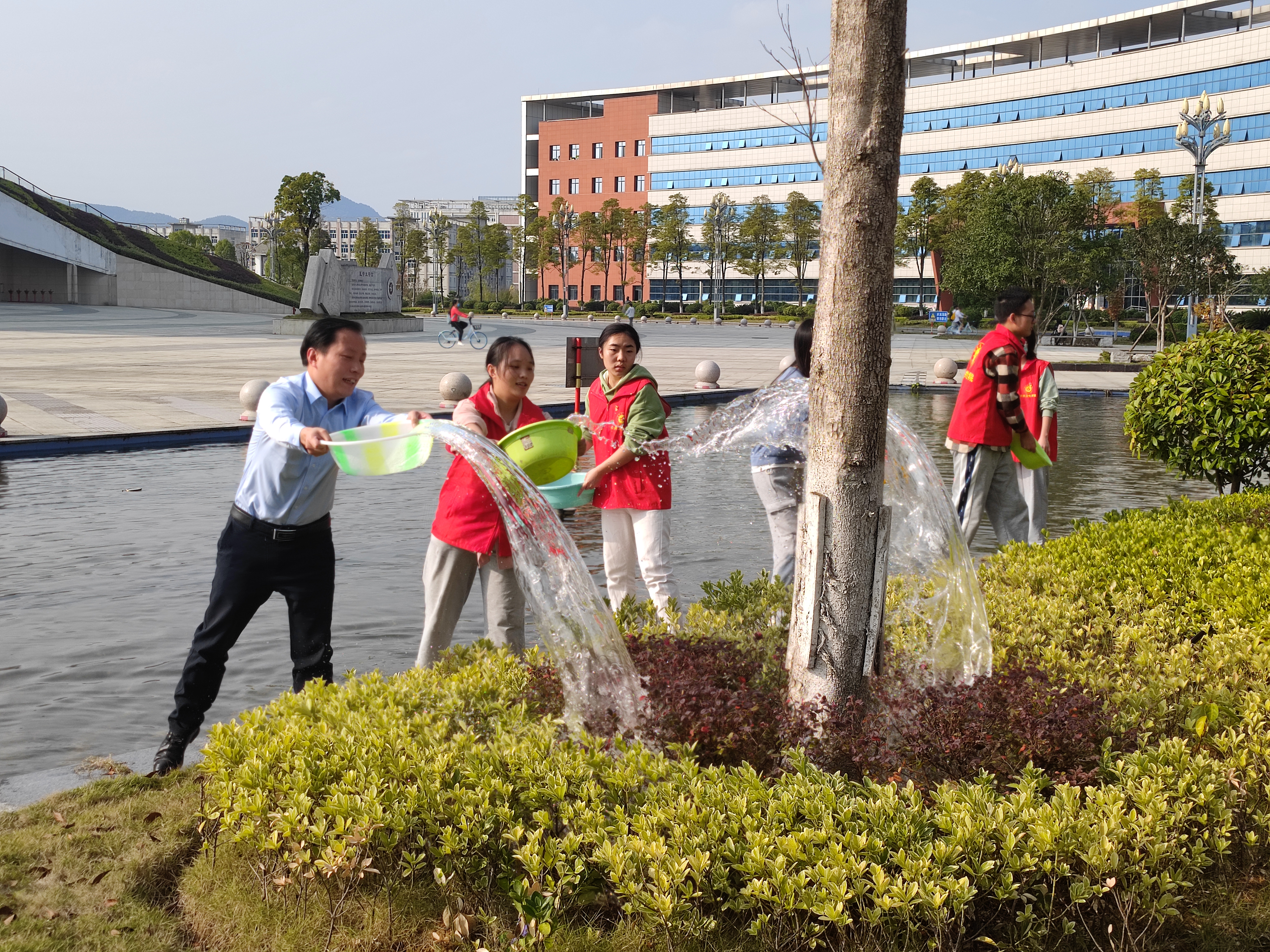 随后,大家踊跃参加到活动中来,有的利用第四教学楼前的池水用水盆浇草地,有的在捡垃圾,有的在扫地……,活动持续大约1个小时,大家都在为美丽校园贡献自己的一份力量。