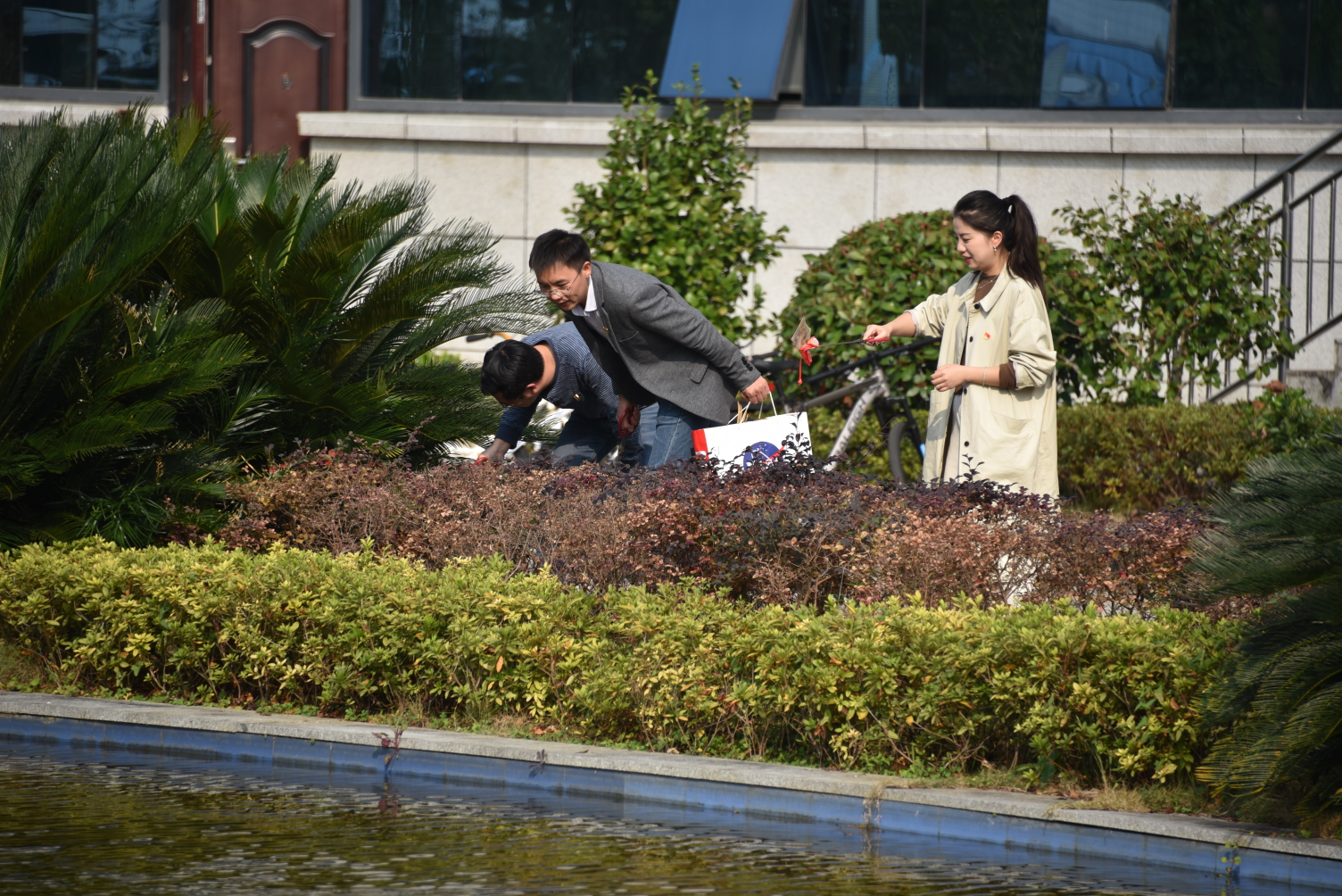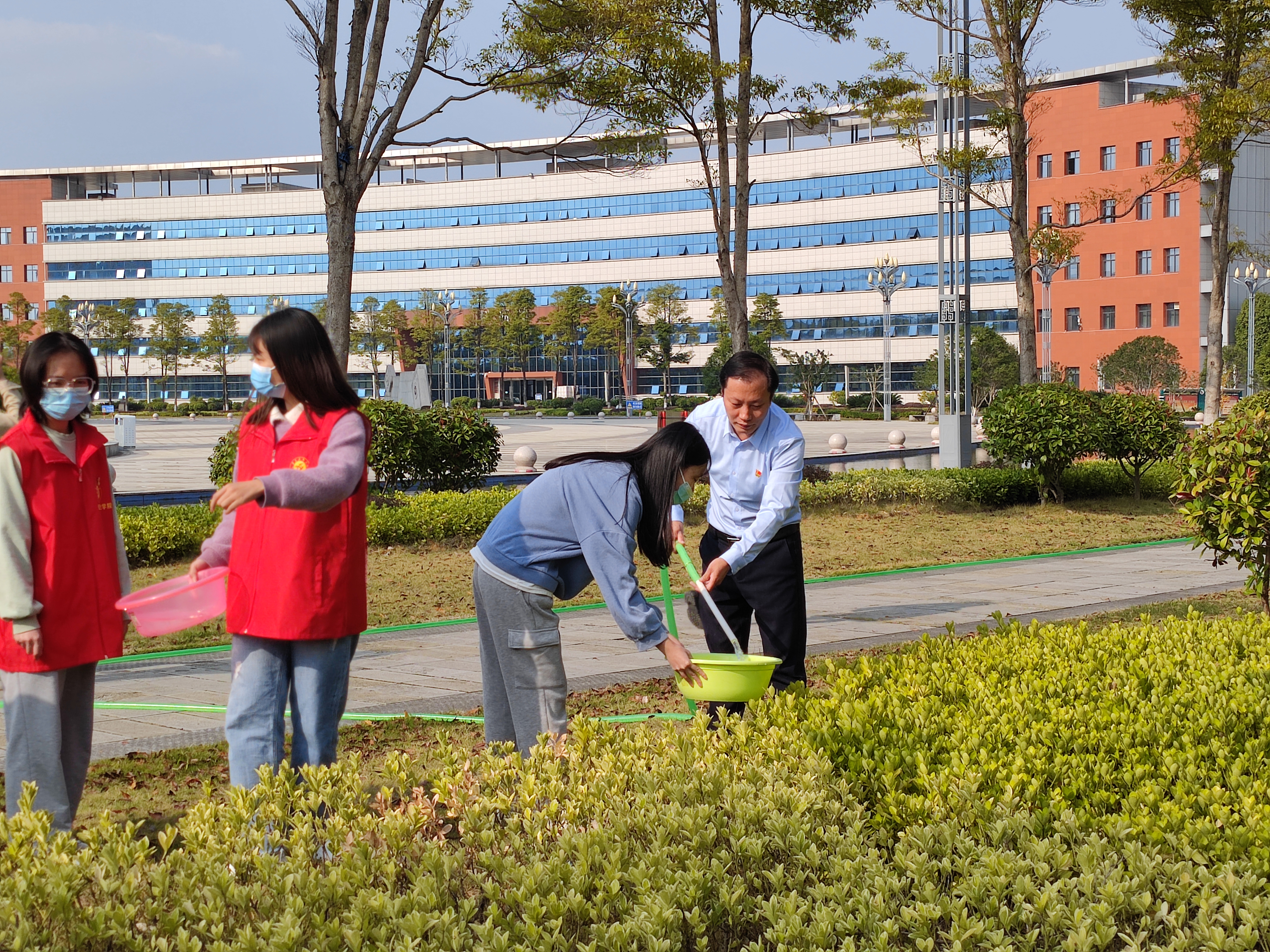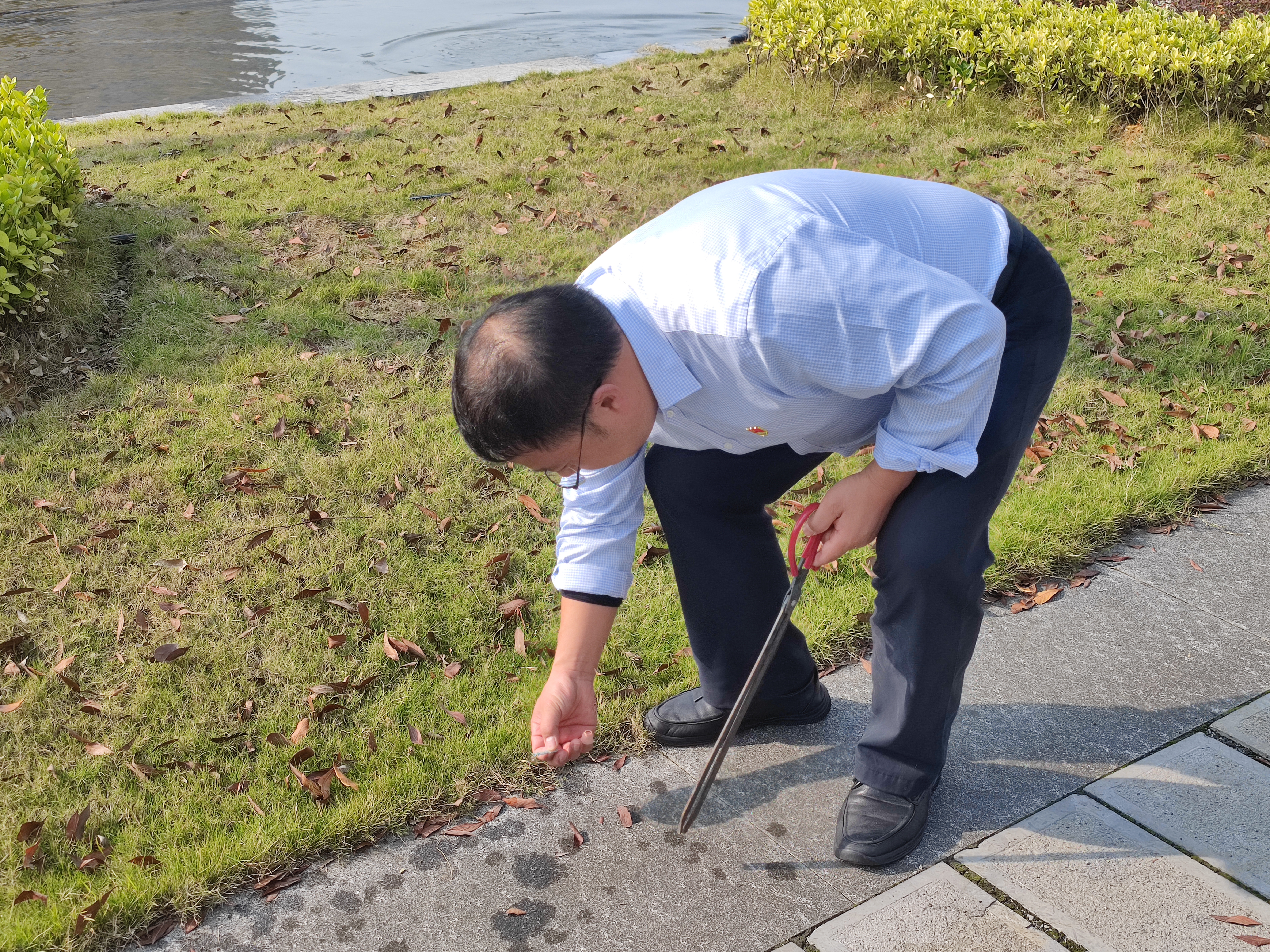 随后,大家踊跃参加到活动中来,有的利用第四教学楼前的池水用水盆浇草地,有的在捡垃圾,有的在扫地……,活动持续大约1个小时,大家都在为美丽校园贡献自己的一份力量。