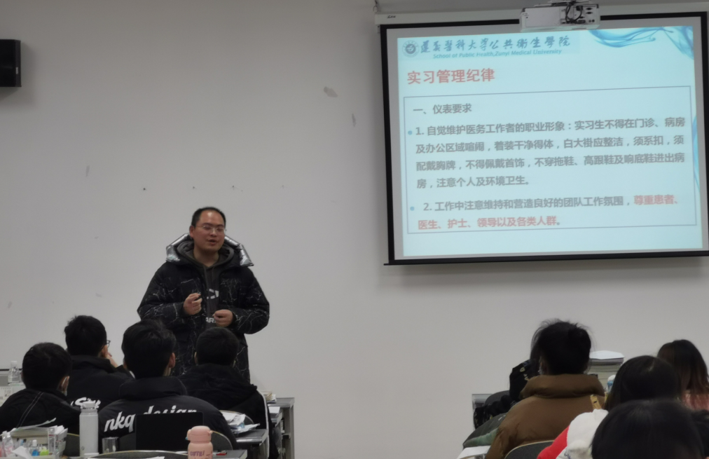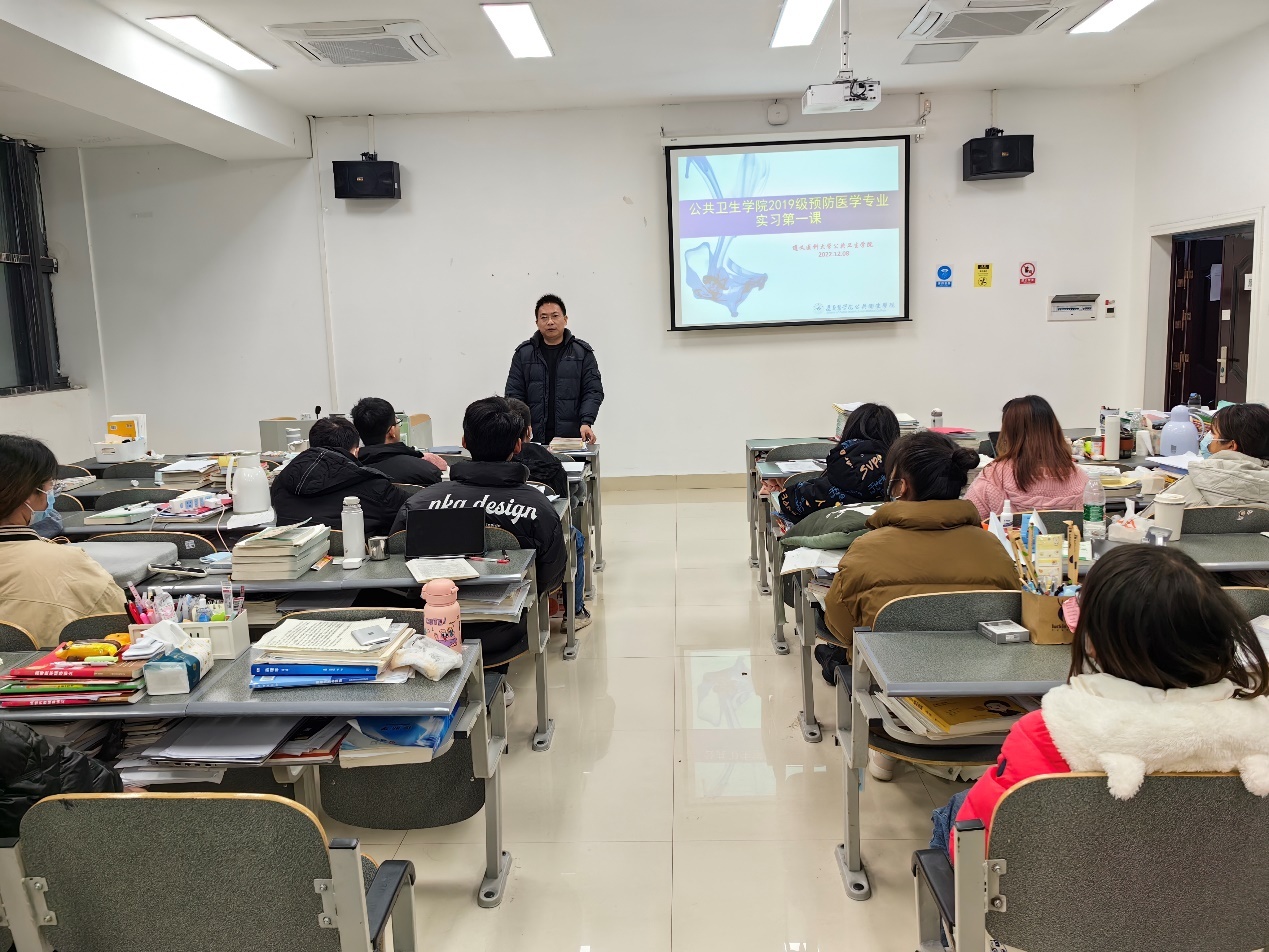 2022年12月8日下午6:30,太阳成集团tyc234cc主页在四号教学楼A-509召开了2019级预防医学本科专业实习动员会。会议由太阳成集团tyc234cc主页副经理周远忠教授主持,2019级预防医学的全体同学参加了此次会议。