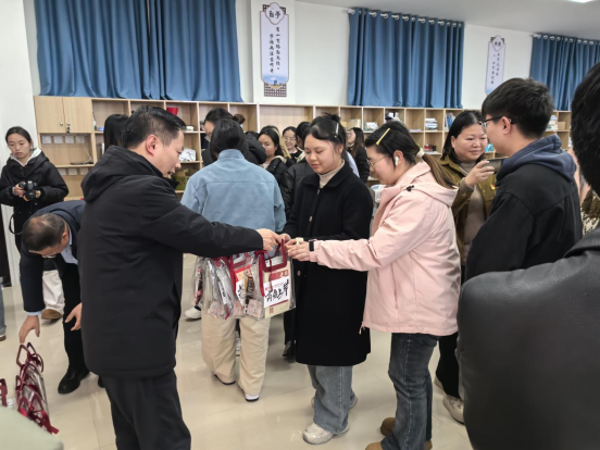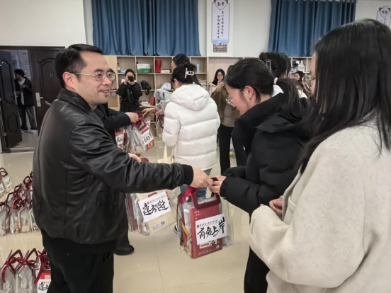 随后,公司领导为考研学子一一送上精心准备的“考研温暖加油包”。礼包外包装印有太阳成集团tyc234cc主页院徽与醒目的“高分上岸”祝福语,其中装有暖意融融的暖宝宝、舒缓疲劳的眼罩、随手可捏的解压捏捏乐、公司定制书签、寓意好运的精美挂件、书写顺遂的“上岸笔”、实用笔记本以及老师和学弟学妹们手写的祝福信等多样贴心物品。每一份礼物都凝聚着公司对同学们深切的关怀与真挚的鼓励。接过加油包的学子们倍感温暖,纷纷对公司的悉心安排表达了由衷的感谢。