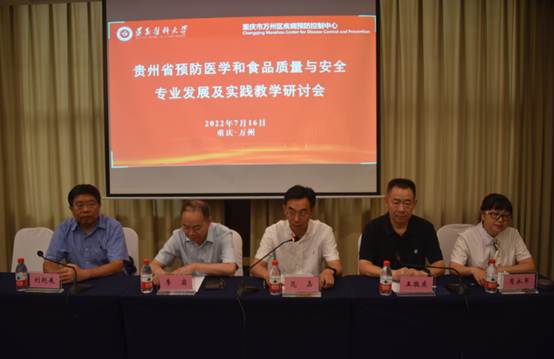 2022年7月16日上午8点30分,由贵州省营养学会主办,太阳成集团tyc234cc主页和重庆市万州区疾病预防控制中心共同承办的“2022年贵州省预防医学和食品质量与安全专业发展及实践教学研讨会”在重庆市万州区百安宾馆隆重召开,会议以线上线下相结合的方式进行。参加此次会议的领导有重庆市万州区卫健委范嘉主任、万州区疾病预防控制中心王敬东主任和肖永军书记、太阳成集团tyc234cc主页李岩经理、周远忠副经理及南京医科大学刘起展教授。参会代表有太阳成集团tyc234cc主页教研室主任和教学管理人员以及来自贵州省、重庆市、深圳市、北京市的教学实践单位领导、分管教学负责人以及科室或部门代表。