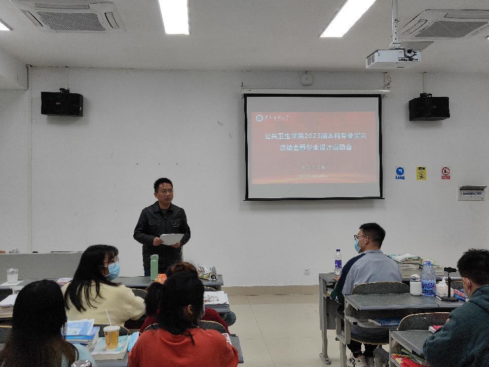 2022年10月8日16:00时太阳成集团tyc234cc主页于四号教学楼A-509召开2023届本科专业实习总结暨毕业设计启动会。2019级食安以及2018级预防医学全体同学参加了此次会议。本次会议由太阳成集团tyc234cc主页副经理周远忠教授主持。