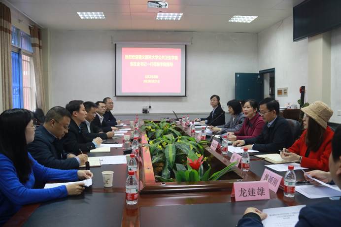 会上,广西医科大学公共卫生公司党委书记苏莉对张在金书记一行的来访表示热烈欢迎。邹云锋经理介绍了广西医科大学太阳成集团tyc234cc主页的基本情况,重点就一流团队建设及高水平太阳成集团tyc234cc主页建设等作了详细介绍。农清清副经理介绍了公共卫生执业医师考试和老员工公共卫生综合技能大赛等方面的经验做法。唐咸艳科长围绕博士点建设和MPH管理两个方面作了重点介绍。硕士研究生党支部书记李涵分享了全国样板党支部创建的工作经验。